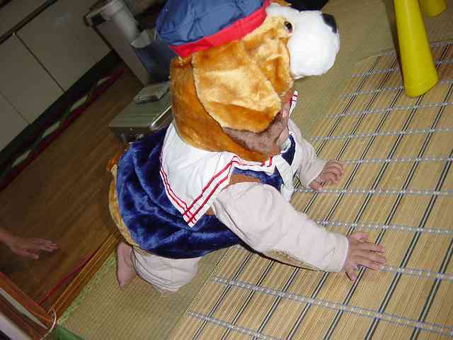 昔、とちとちが産まれた頃に、通販の着グルミを食い入るように見ていたKUROCCO(くろっこ)を奥様が覚えていたせいで、特売で安くなっていた、着グルミ、「イヌ君」を買ってきてくれました。\(^_^)/