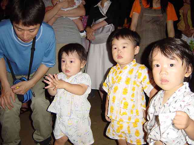で、写真。。お友達と走り回るので、ほとんどまともな写真が撮れませんでした。夕方だから離れるとフラッシュが届かないし。。で、ケイちゃんと並んで、先生達の盆踊りに見とれている図を。。