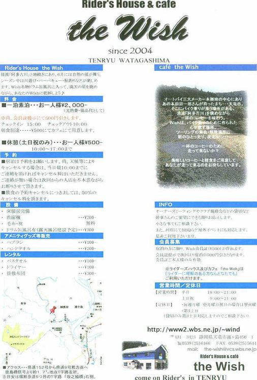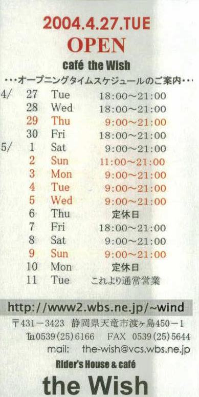 ちょっとひとっ走りしたい時ってありませんか?でも用事が入ってたり、早々に帰って家庭サービスもしないと・・・(^^;なんてことありませんか?そんな時に、Wishまで一杯のコーヒー飲みに走ってみてはいかがでしょう?。軽食と飲み物を用意してお待ちしています。